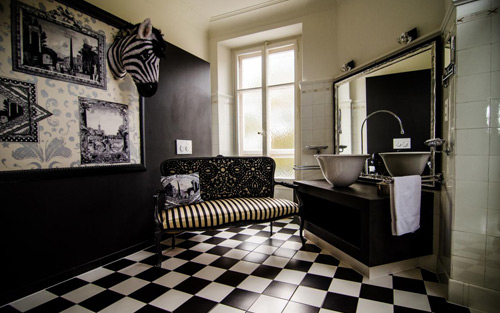Belle chambre avec balcon et vue en enfilade sur le parc, le Lac Léman, et les Alpes. Le jeu de couleurs aux murs et la décoration baroque auraient charmé le jeune séducteur napolitain Polichinelle.